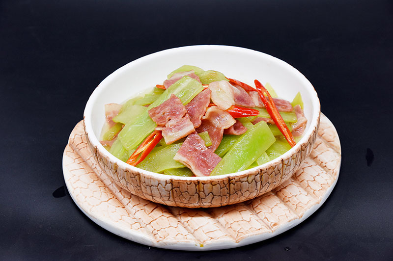3.將蒜瓣切丁導(dǎo)入熱鍋中翻炒,導(dǎo)入萵筍片繼續(xù)翻炒,再加入培根段及線椒絲繼續(xù)翻炒一段時(shí)間,放入適量食鹽,翻炒均勻后即可出鍋。