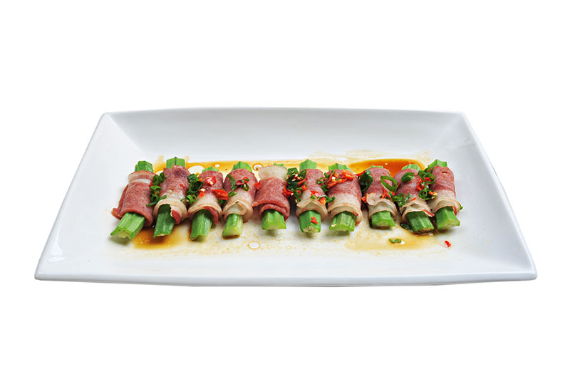3.將秋葵段卷起擺盤,淋上甜辣醬即可,撒上紅椒段及香蔥絲即可食用。